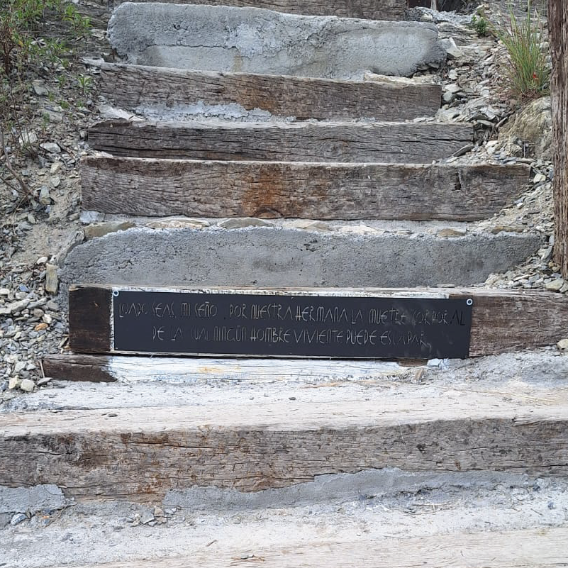 Este año 2025, en que se conmemora el 800 aniversario del «Cántico de las Criaturas» de San Francisco de Asís, se decidió embellecer el sendero integrando 12 estrofas del cántico. Cada estrofa está grabada en placas metálicas de 90 cm de largo por 15 cm de ancho, instaladas en algunos de los durmientes orientados hacia la ciudad, permitiendo a los peregrinos hacer pausas, contemplar y meditar en el mensaje de alabanza a la creación.